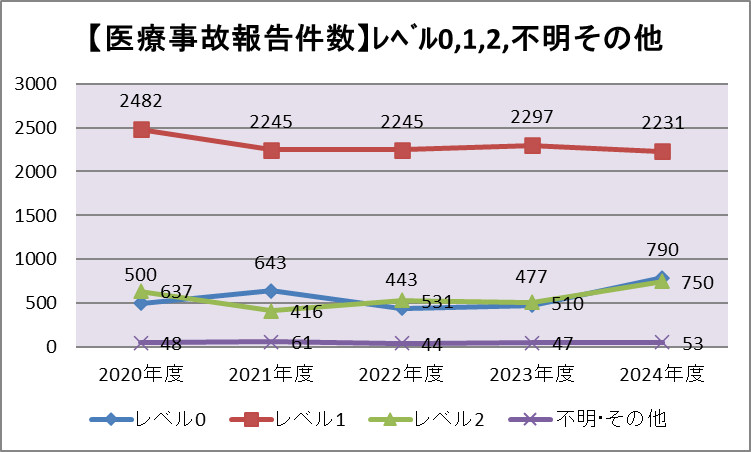 レベル0・1・2は安全確認作業で、間違いを回避できた、あるいは早期発見により健康被害がなかった報告です。 例えば、入院生活中に病室や通路などで転倒、あるいは患者様が薬剤を飲み忘れたが実害がなかった場合などもこれに含まれます。