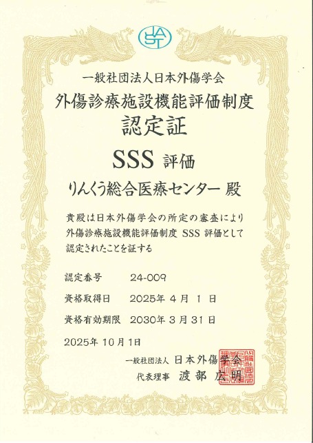 | このたび、りんくう総合医療センターは、日本外傷学会 外傷診療施設機能評価において、最高ランクのSSS評価を取得しました。 本評価は、重症外傷患者を24時間体制で受け入れ、迅速かつ組織的に診療できる体制が整っている施設に与えられるもので、全国でわずか12施設のみです。 大学病院や大規模病院が多くを占める中、388床規模の中規模市中病院としてこの評価を受けることは極めて異例であり、大阪府泉州救命救急センターの医師と看護師が中心となって積み重ねてきた重症外傷診療の実践に、他診療科、診療支援局、事務局を含む病院全体の支援体制、さらには地域の病院前救護を担う消防の皆さまとの協働体制が加わった結果として、今回の評価につながったものと受け止めています。 今後も大阪府泉州救命救急センターは、りんくう総合医療センターの一部門として、地域の皆さまに信頼される重症外傷診療を継続的に提供できるよう、チーム一丸となって取り組み続けます。 【日本外傷学会 外傷診療施設機能評価】(外部サイトへ移動します) |